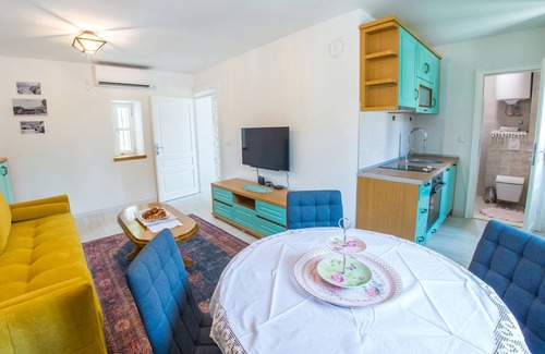 On the ground floor there is a studio apartment with a living room and a sofa which can also be a sofa bed. Also, there is a small kitchen with dining area, TV, air conditioning, bathroom.