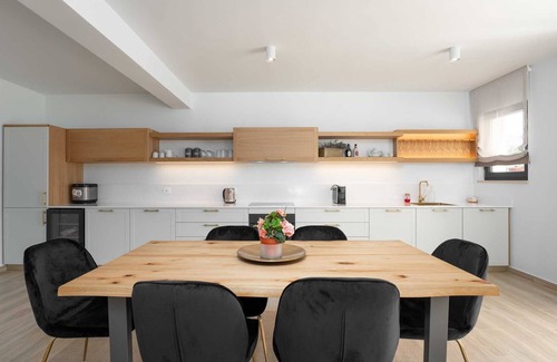 Villa Roti is designed to combine modern style with rustic charm – refined, minimalist lines blend seamlessly with the warmth of wood and natural materials. Upon entering, you step into a high, light-filled space with an open white kitchen, equipped with modern appliances and a thoughtful layout. The dining room is spacious yet intimate; the large table invites long meals, laughter, and shared moments. The living room, with its comfortable sofa, is perfect for afternoons with a book, music, or conversations.