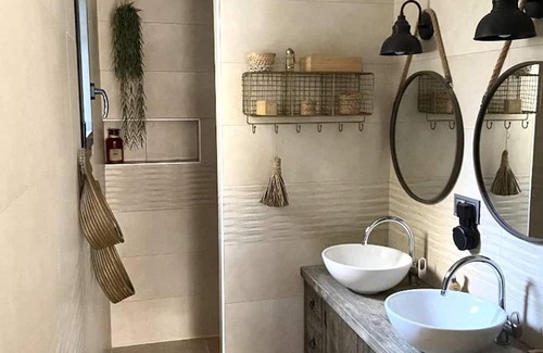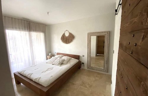 Not far from Aigues Mortes, we offer you this sublime 160m² house. It consists of a master suite with dressing room and bathroom on the ground floor, a fully equipped kitchen opening onto the large living room, a laundry room with washing machine and dryer. You can also occupy your children in a room specially dedicated to them. Upstairs, you will find 2 large bedrooms with double beds which each have their own bathroom. Its sleeping capacity is 6 people. Its garden with a bohemian atmosphere with its large banana trees will delight you with its salt swimming pool heated to 29°. A pool house area has been set up with a dining bar fully equipped with a barbecue, a freezer and a fridge. The ultimate centerpiece of the garden, the wooden four-poster bed overlooking the swimming pool, which promises a nap and relaxation in complete comfort. With its bohemian decoration, from Bali, and its high-end services, this villa is undoubtedly the dream place to relax with family or friends.