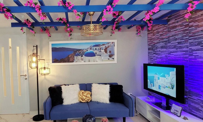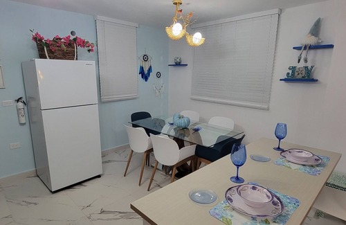 Themed apartment, cozy atmosphere Santorini Greek island motif. Perfect oasis in the urban area of Bayamón, 25 minutes by car from San Juan. Private access, 3 A/C rooms, equipped kitchen, 3 smart TVs, 2 parking spaces, laundry available for guests staying 4 days or more. There is A/C in the common living-dining room area, necessary for tropical weather. 2nd level unit (NO elevator) close to several shopping centers, restaurants, supermarkets and a pharmacy. Secure complex with gated access. It is a Transformation in time and space of one of the most important islands in Greece called Santorini, here we managed to transport these beautiful refreshing landscapes of the island with its blue domes of unique color in the Mediterranean Sea, its White colors of infrastructure and more. A decoration that allows you to enjoy the entire space of the apartment on this beautiful island. Villa Santorini has 100% solar energy to continuously enjoy your vacation in full comfort and peace of mind from the electrical service.