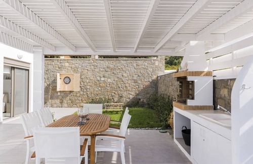 Villa Sea La Vie has 3 fully air-conditioned bedrooms with double beds in warm tones and a unique contemporary design. There are 3 unique bathrooms with a shower. The kitchen is fully equipped to accommodate your culinary habits, as well as your experiments with local products and recipes. The ample living room is particularly inviting, with beautiful furniture and plenty of free space to use as you please. There is a flat screen with satellite channels in each bedroom and free Wi-Fi throughout the property. The property’s outdoor space is a highlight on its’ own merit. You will enjoy your time at the private swimming pool as the deck is fully equipped with sunbeds and parasols. Outdoor seating areas include the deck and a beautiful veranda with BBQ and outdoor dining table overlooking the enchanting Kiotari beach.
