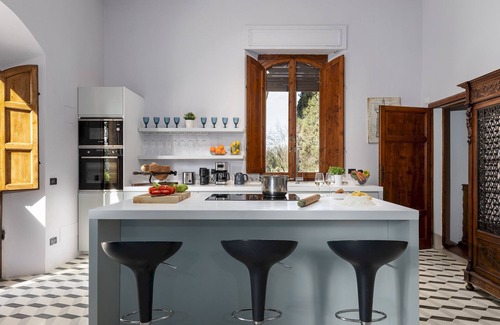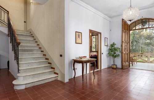 The villa is surrounded by about 2000 square meters of fenced and well-kept garden. The entire garden surrounding the villa is covered with white gravel and enriched by a variety of vegetation, including cypresses, cedars of Lebanon, maritime pines and laurels. In front of the main entrance, there is a seating area, furnished with wooden sofas and shaded by centuries-old pine trees. Inside the gate there is a parking area and, in an annex near the villa, there is a laundry room. A short path crosses the lawn to the pool terrace, where the outdoor dining area, complete with pizza oven and barbecue, is located in a panoramic position with views of the surrounding countryside. N.B.: Please note that the photo shoots are usually carried out in spring, so the colors and blooms of the gardens, lawns and parks may be different when you enter the villa.