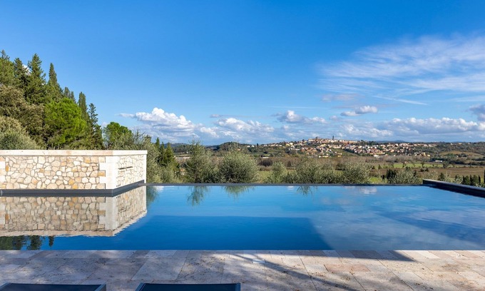 Villa Silvia is an elegant Art Nouveau style residence, located at the foot of the hilly village of Peccioli. Surrounded by a well-kept garden shaded by tall pine and cypress trees, this unusual villa has been carefully restored and furnished like a refined home away from home for up to ten guests. Combining traditional Tuscan style with modern elements, the comfortable interiors feature travertine, sandstone, fine fabrics and antiques. Ideal for families or groups of friends, the villa is spread over two floors, with five bedrooms, a bright living area, a modern kitchen and a spacious dining room. The lush garden is furnished for relaxing days, with a pizza oven, dining area and outdoor seating area. A distinctive element of the property is the designer infinity pool, in a panoramic position with a view of Peccioli.