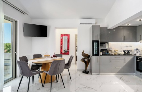 Nestled just 30 meters from the shores of Tavronitis Beach in western Crete, 6 Star Villa is a stylish three-bedroom retreat designed for comfort and relaxation. Combining modern design with traditional Cretan charm, the villa offers a peaceful escape just a short walk from the village center. Inside, the open-plan living area on the ground floor is bright and spacious, featuring cozy seating, a 43" smart satellite TV with Nova channels, air conditioning, and a Bluetooth stereo system. Guests can enjoy board games or unwind after a day at the beach. The fully equipped kitchen, located on the lower ground floor, includes everything from a Nespresso machine and blender to a dishwasher, microwave, toaster, and oven—ideal for preparing meals or a quick breakfast.