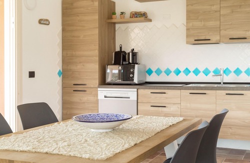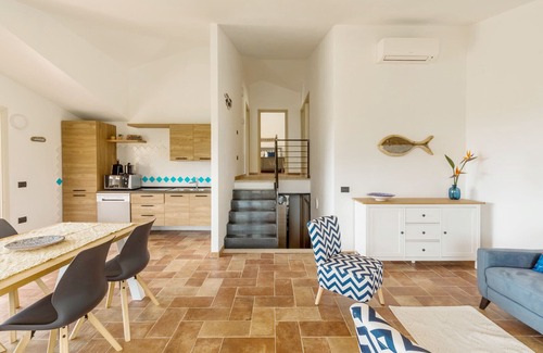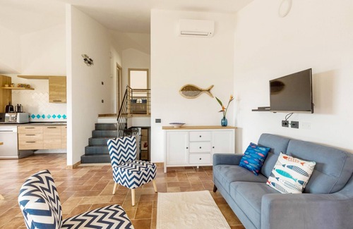The rooms, spread between the raised ground floor and the basement, offer intimate spaces whose details recall the Sardinian tradition revisited in a modern key. The two double rooms on the raised ground floor and the single room, with its pull-out bed, overlook the well-kept private garden, while the rooms in the basement (two double rooms and one single room with a pull-out bed), although lacking direct light, open onto light wells enriched with sculptures that narrate the sea of Sardinia, transforming every awakening into a unique experience. The villa also has an additional furnished space, with a second kitchenette, ideal for hosting groups and enjoying evenings of complete relaxation, without disturbing the quiet of the sleeping areas.