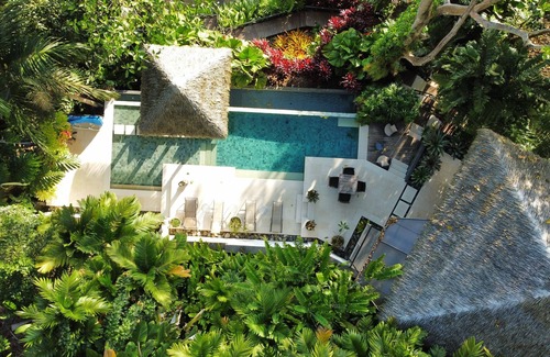 The compound consists of 2 tropical modern style thatched roof Palapas with Balinese flare. Each Thatched roof palapa is designed to accommodate 2 in a luxurious bedroom, with a king bed, and bath opening to ocean views and nature on all sides. The woods have been hand selected down to picking the trees to bring in rich native woods while keeping clean, contemporary lines. Cool Columbian limestone floor tiles and Sandstone carvings brought in from Bali add elegant but tropical accents to each palapa.
