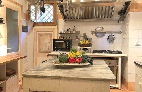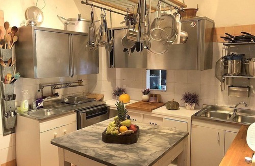 You will be able to enter the first kitchen from the dining room through a corridor. It is equipped with a five-burner gas cooker, an electric oven, a refrigerator with freezer, a dishwasher, an Italian-style coffee-maker, an American-style coffee-maker (bring your filters!) and a kettle. The kitchen has a small high window.