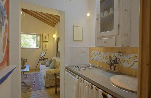 You will be able to enter the third living room through an access area. The floor is paved with wood. The ceiling is sloped and has characteristic exposed wood beams and terracotta tiles. The furnishings are warm and welcoming. The furnishings include two sofas. There is a small fireplace. In the living room you will also find a cooking area. The kitchenette is equipped with a two-burner electric cooker, a small refrigerator without freezer and an Italian-style coffee-maker. In this room you will find a satellite television (local channels). From the living room you will be able to enter the patio through a French door. The room has a window.