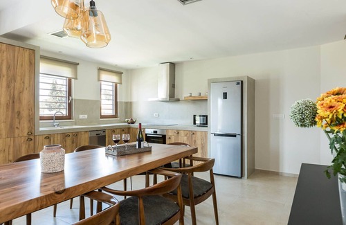 Open plan fully equipped kitchen with a dining area for 8 guests and modern appliances