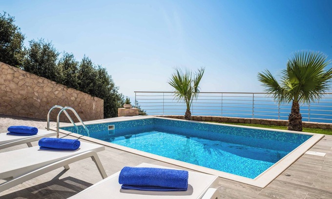 Step into a world of comfort and serenity at Villa Smaragda Vlachata. Dip your toes into the sparkling pool or feel the gentle sea breeze as you unwind on a sun lounger under the sways of palm trees.