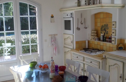 An outdoor 'Guinguette' style kitchen, equipped (fridge, oven, plancha ...) serves a terrace for pleasant moments.