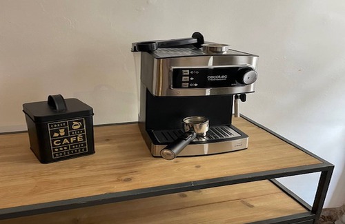 a ceramic hob, an oven, a microwave, and an espresso coffee machine (ground coffee), a toaster, a refrigerator, where you can enjoy your meals at the large solid wood table (with extension if needed) with family or friends.