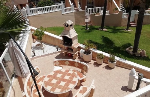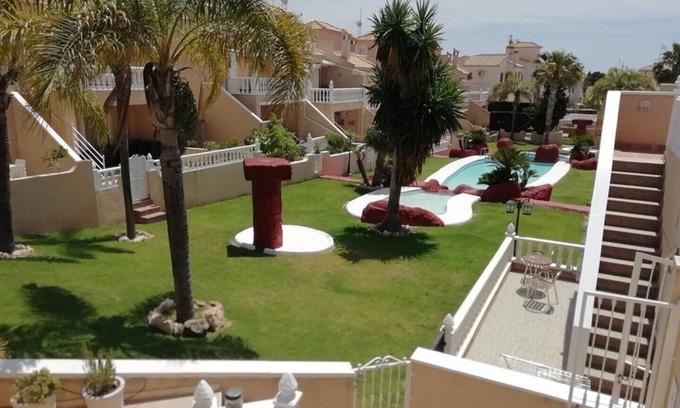 Our recently refurbished, attractive and self contained house with large roof terrace is in a small terraced development. Located in a quiet residential area but within walking distance to all amenities, with three private terraces, British and Spanish tv, and DVD. Aircon in all rooms. The back door of the property opens out into a private garden with a lockable gate which opens directly to the communal gardens and pools. There are three pools, a children's shallow pool, a standard pool and a deep pool all joined by waterfalls.