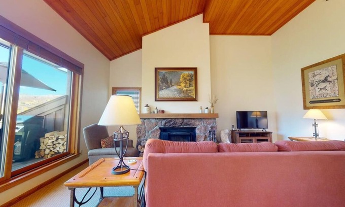 Villas 1633 is a two-bedroom, two-bath condominium. The top-floor retreat features an open floor plan with a kitchen, a living area with a sleeper sofa, and a large balcony with mountain views. The first bedroom has a queen bed, while the second bedroom has two twin beds. Enjoy high vaulted ceilings, cozy furnishings, and a wood-burning fireplace, making this a perfect escape for relaxation and adventure.