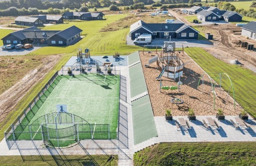 This charming cottage, situated on the picturesque island of Als, can comfortably house up to 24 guests. It\'s nestled in a hilly landscape, near beautiful beaches and the bustling town of Sønderborg, known for its numerous cafés and shops. The cottage boasts a spacious interior filled with various amenities and activities.The property features a pool area complete with a water slide and counter-current system, perfect for fun-filled hours of swimming. After a swim, guests can unwind in the sauna for a relaxing wellness experience. The large activity room offers table tennis, billiards, table football, darts, and a PlayStation 4. A corner bar with its own fridge provides a perfect spot for spectators.The heart of the home is an open-plan living and dining room, complete with a wood-burning stove for cozy evenings. The expansive XL kitchen is fully equipped with two sinks, an extra-large cooker, two ovens, two dishwashers, and ample refrigerator space, encouraging guests to showcase their culinary skills.The cottage offers nine bedrooms spread across three separate areas, each with a bathroom, and an additional bathroom in the pool area. A loft space provides extra sleeping quarters for six guests.The cottage is part of the Mommark community, which provides access to a large outdoor play area and multi-purpose court for various sports. An extra-large terrace with a sandbox and swing set offers additional outdoor entertainment. Despite ongoing construction in the area, guests can enjoy a memorable holiday in this well-equipped cottage.