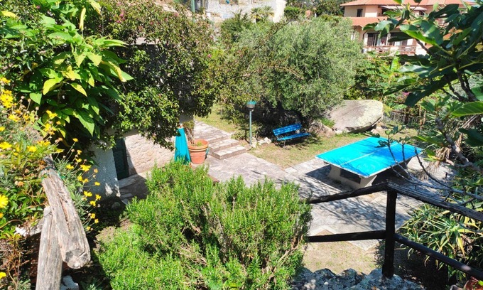 Intimate and completely fenced location, with large outdoor spaces. The property is located on a mezzanine floor (on the ground floor there is a second apartment which is used by the owners) and is accessed from a large equipped terrace overlooking the sea . The house is arranged entirely on one floor, the entrance consists of a small living area with a French sofa bed and TV, dining room with kitchenette. The sleeping area consists of two bedrooms, both with two joinable single beds. Bathroom with shower and washing machine. The house is completed by a large garden, equipped with a ping pong table, barbecue and outdoor shower.