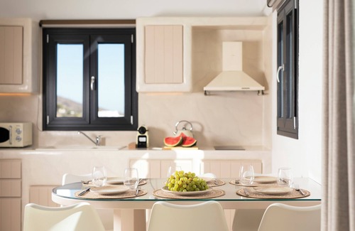 The enchanting terrace of Vinebranch Villa is a real magnet that attracts every visitor, as it is ideal for all hours of the day. It features sun loungers to enjoy the sun and a beautiful swimming pool for refreshing dips. Enjoy a delicious meal or a refreshing drink in the dining area, overlooking the endless blue of the Aegean Sea and the traditional vineyard.