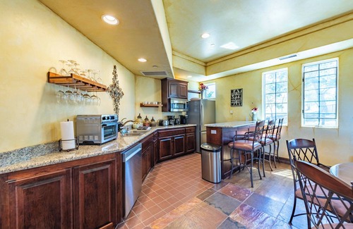 Walk through the front door and into the great room. A complimentary wine tasting awaits your arrival at the tasting room. The great room is the heart of this home. Centered around the stone, wood-burning fireplace are two loveseats and a side chair with comfortable seating for 5+.
