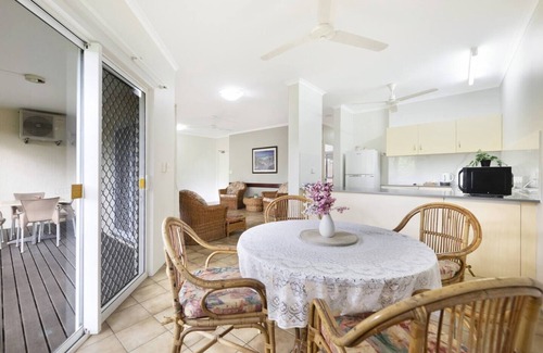 A tiled, open plan kitchen, dining and living area offers four large and comfy armchairs to kick back and relax around the TV, with ceiling fans and air-conditioning throughout to keep you cool on balmy, tropical days. Enjoy expansive views out to the lush garden surrounds through glass sliding doors, which open out to the undercover decked balcony where a table setting offers a scenic outdoor dining option.