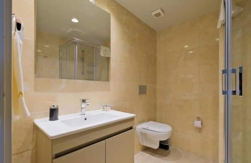 Bathroom - This modern bathroom has a beautiful-looking mirror, shower, and sink. Constant hot water and high water pressure are available. The toilet seat has a bidet.