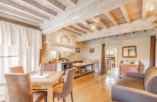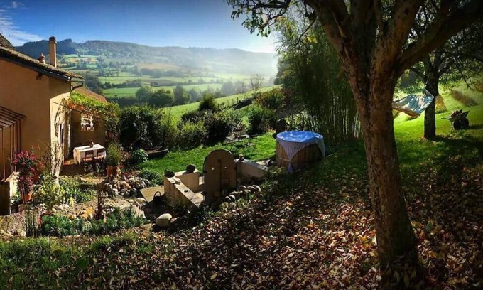 Christelle & Jean-Noël, artist photographer working in particular in the field of cinema (workshop on site) welcome you to a charming authentic traditional farm of character from the 17th century, completely restored with care, nestled in the peace of the countryside in the hollow of a vast estate steeped in history including several buildings all perfectly rehabilitated according to the rules of the art (former agricultural "mini hamlet"). Absolutely enchanting setting & site a stone's throw from the first vineyards, nestled on the edge of meadows on an exposed hillside, under the wooded ridges of a wild forest massif, overlooking "from a balcony" a bucolic rural valley facing Mont Saint-Romain (579m), exceptional belvedere offering a 360° view as far as Mont-Blanc on a clear day (3.5 km). Total tranquility & literal haven of peace. Wildlife observable on site. Magnificent panorama & landscapes. Very comfortable cottage. Warm country character enhanced by careful heritage restoration (original fireplace mantels, beams and ceiling, lintels, molded doors, etc.). Lots of charm & character. Cocooning atmosphere combined with the exotic soul of an old residence. Pleasant shaded terrace under a wisteria opening onto the garden (complete with a large sheltered terrace). Vast grassy property of 10,000m², carefully planted with trees and flowers, with multiple relaxation and rest areas and a small henhouse. Composition: Access to the property via 300m of ascending stony road. House adjoining the owners' home (complete independence without vis-à-vis). Washer/dryer in shared laundry room. Electric heating + 2 wood stoves. Wireless. Gite on the ground floor: kitchen, living room (double sofa bed 160x190cm), bedroom-lounge (double bed 160x200cm), bathroom (shower/Wc). Private terraces + parking. Shared garden. Shops including mini markets 10 km. All amenities 13 km.