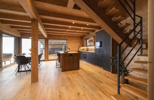 The stylishly furnished holiday home accommodates up to 10 people. On the ground floor, you will find a cozy living area with a fully equipped kitchen, a spacious dining area, and a comfortable sitting nook by the fireplace. Enjoy the breathtaking panoramic views while sipping a fine glass of wine or a warm cup of coffee.