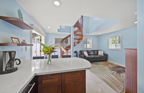 Inside the French doors, you walk into a full kitchen with an apartment-sized stove and refrigerator, custom cabinetry, and stone countertops. Ahead you will find a living area with a sofa that can pull into a queen sleeper and a custom twin-sized trundle bed for extra guests. Going up the custom spiral staircase you come to the main bedroom loft featuring a desk area, tv, and California king sized bed. Stay cool with the split AC unit or many windows that allow the ocean breezes to flow through.