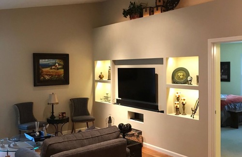 Spacious, well-appointed rooms. 2 bedroom 2bath. Master bedroom has a king size bed,setting area and en-suite bathroom. The other bedroom has a Queen size bed with setting area and en-suite bathroom. You are also welcome to enjoy the amenities at our other home...Shadow Lake, the swimming pool and our soon-to-be-famous Japanese-Redneck Garden - just 3 miles away