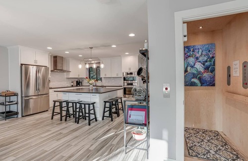 The inside of the house is stylish and has everything you and your group needs during your visit to SA! Every bedroom has an en-suite bathroom, which is rare. The first floor is where you will enter the house via keypad. There you will find a bedroom with a king bed, the washer and dryer and our garage-game room. When it's too hot or cold to enjoy the rooftop, spend some time challenging your friends or family to a game of ping pong or play one of our metal board games! This bonus space is sure to keep your group entertained between outings. You can choose to either go up the stairs or the private elevator from here! The 2nd story contains two additional bedrooms, with a King and Queen bed respectively and full bathrooms. If you're working from home, we have a desk and printer with high-speed internet available. The third story is the kitchen and living area. With a 65 inch smart TV and furniture that's thoughtfully laid out, it's a great spot to watch TV with your group or play one of our many board or card games! The kitchen is packed with high-quality kitchenware. From the pots and pans to the utensils, you will find all our kitchen equipment clean and plentiful. There is plenty of seating at the dining room table and the huge kitchen island so prepping and enjoying a meal with your group will be a great experience! There is also a half bath, walk-in pantry, and both a Keurig and standard coffee maker! We provide plenty of coffee for you too!