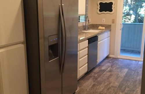 Quiet and cozy two bedroom condo in the gated community of Ritz Pointe. The kitchen has been updated with new stainless steel appliances,tile flooring and granite countertops, all kitchen cooking utensils are provided,including a Keurig 2.0 coffee maker. The gated community has a pool and three spas, one of which has amazing ocean views. The bedrooms feature a king bed in the master and a queen bed in the guest. Both feature brand new mattresses and large walk-in closets. The living room has a flat panel television above the gas fireplace and ample seating and a queen sleeper sofa. There is also a separate dining room with seating for 6. This unit is fully stocked with towels, beach chairs and other beach gear. the large wrap around patio is perfect for BBQ's. The unit also has a washer and dryer for your convenience.