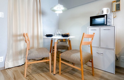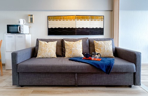 After a busy day experiencing the city, relax in this charming and comfortable apartment, sized 33 sqm/355 sqft. This unit is ideal for couples, groups, or families up to four people. There is air-conditioning throughout for the summer, and the same system ensures you are heavenly-warm for the winter. Wireless Internet is provided free for your use. This sunny unit is on the sixth floor, with a view of the neighboring greenery and the Tokyo cityscape to the south from a private balcony.