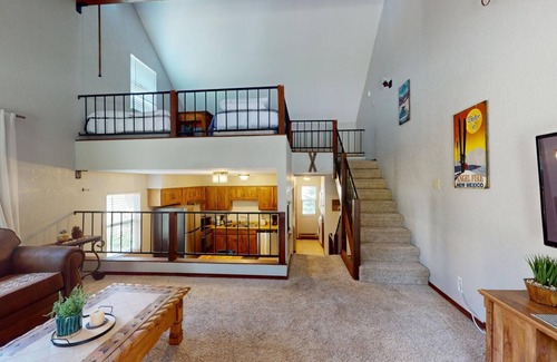 Escape to the serene mountain landscapes of Angel Fire, NM, with a stay at Angel View 6-6. This charming condo offers the perfect balance of comfort with modern amenities, making it an ideal getaway for families or groups of friends. Accommodating up to 9 guests, this 1-bedroom, 1-sleeping loft, 2-bath retreat ensures a memorable stay. The main bedroom features a king bed and an ensuite bathroom. The living room offers a king fold-out couch, providing additional sleeping space, and is a cozy spot with a gas log fireplace and a smart TV. For larger groups, the loft sleeping area, open to the living room below, includes a queen bed, double bed, twin bed, and an additional TV for entertainment. Angel View 6-6 has modern amenities to enhance your stay. The gas fireplace in the living room adds warmth and ambiance, while the in-unit washer and dryer offer convenience for longer stays. High-speed internet and a smart TV ensure you stay connected and entertained. Parking is hassle-free with a one-car garage and additional parking spots located across from the entrance. Upon entering through the garage, you'll find a propane wall heater to keep the space warm and comfortable. The first half flight of stairs leads to the main bedroom, which boasts an ensuite bathroom and a private deck. Another half flight of stairs takes you to the kitchen, featuring new appliances and a dining table, as well as a full bathroom. Continue up another half flight of stairs to the living room, where you can relax by the gas fireplace or enjoy the main deck with outdoor furniture. Finally, the loft sleeping area, provides ample sleeping space and an additional TV. Nestled in the heart of Angel Fire, this cozy retreat is perfect for those looking to explore the natural beauty and outdoor activities the area has to offer. Whether you're hitting the slopes in winter or enjoying the hiking and biking trails in summer, Angel View 6-6 provides a welcoming and comfortable home base for your adventures.