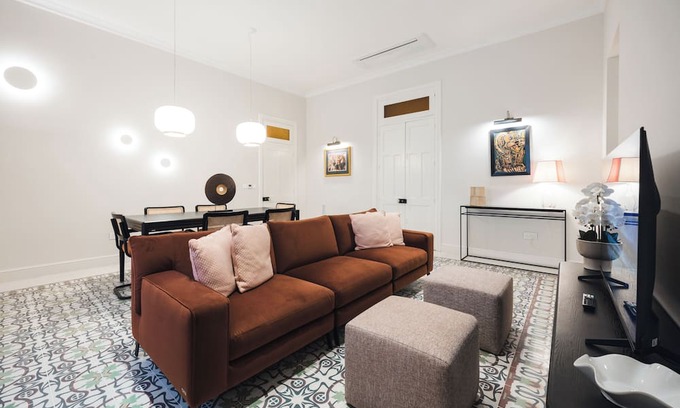 Balluta 12B Suite brings warmth and charisma to luxury living. With a striking burnt-orange sofa and soft geometric flooring, the apartment is both inviting and visually captivating. Thoughtful lighting enhances its contemporary edge, while the building’s historic bones provide timeless charm. Every space has been tailored for comfort and exclusivity, where old-world craftsmanship meets fresh modern design.