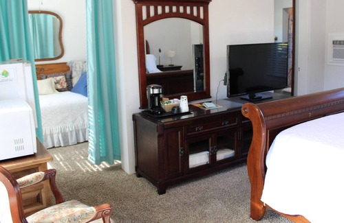 Room 2 - Sleeps 2 - features a queen bed, additional single bed situated in separate nook, chair for relaxing, bathroom with shower and toiletries, television with Firestick TV, free WiFi, microwave, refrigerator, coffee maker with assorted coffee and teas, iron and ironing board.
