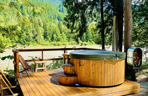 This teepee is located on the Fraser River in British Columbia. Sleeps 4 with a gorgeous king bed and a daybed and pull out trundle. Sit in your private deck which has a bbq and propane burner system and griddle. Sit at your rail top bar and enjoy the views or enjoy a nice fire, both wood burning or propane firepits. This has a separate washroom and beautiful outdoor shower. Try your luck fishing or enjoy hiking and nature