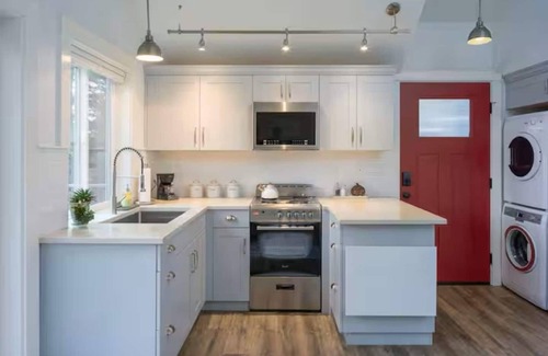 You’ll find plenty of kitchen gadgets, including a blender, hand mixer, cookware, and bakeware to create your favorite meals. Enjoy our coffee bar stocked with Pete's coffee, teas, stevia, sugar, and creamer, along with both a drip coffeemaker and French press, and a coffee grinder. We even have spices and oil in the cabinets! Plus, there’s a full-sized refrigerator with a freezer, and a stackable Blomberg washer and dryer—just note that there’s no dishwasher, so hand washing is required.