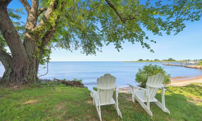 Your cozy getaway awaits in Rock Hall at this charming waterfront cottage. This peaceful retreat is perfect for guests seeking a serene escape. This 3 bedroom 2 bath cape cod w/ first floor master, in welcoming Rock Hall with WiFi, AC, A large wrap around porch and a large yard for activities - features an panoramic view of the Chesapeake Bay and a small private beach, perfect for get togethers, kayaking, swimming, and more. Within walking distance to popular local attractions, this stay offers the perfect balance between a serene and peaceful setting, while also offering many options for enjoying the local amenities.