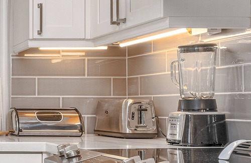 Fully stocked kitchen with stainless-steel appliances, quartz counters, and breakfast bar