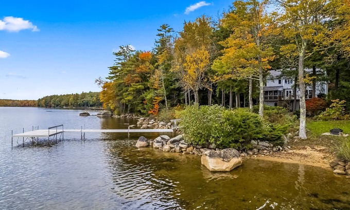 Swim from your private dock and beach, and unwind each day in the hot tub on the deck, at this classic, waterfront home on shimmering Thompson Lake. Whether you're outside on the deck, dining on the screened porch, or telling stories around the firepit at night, this is a place for taking in gorgeous sunsets and listening to the haunting call of the loons.