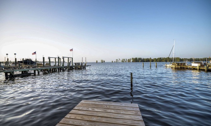 Kick back at this waterfront cottage as rich with history as the charming town it sits in! This 3-bedroom, 2-bath vacation rental features direct access to the Albemarle Sound and views of the iconic waterborne Cypress trees. Stroll a half-mile to explore Edenton's historic district or just around the corner to the marina for an upscale dinner and a boat ride. Take this opportunity to fish right off the pier in the backyard, then cozy up next to the fire with a glass of wine to enjoy the sunset.