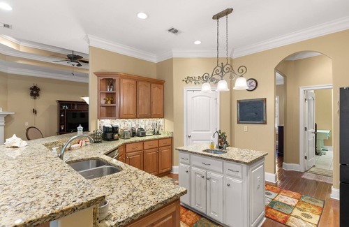 Each room has a theme from around the world. You can experience the Golden Isles Room, the Scottish Room, the Italian Kitchen, the Patriot's Den, the Greek bathroom, the Parisian bathroom, and much more! Two bedrooms have a King bed, 1 a Queen and 1 a Queen sleeper sofa.