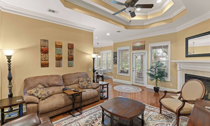 From the spacious living room you walk outside to a HUGE screened in porch. The porch has a swing, lots of seating, a grill and a beautiful view of the plush backyard adorned with live oaks.