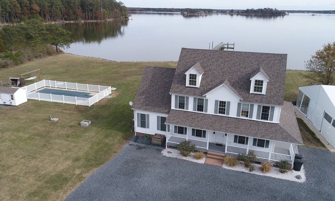 A private pier over the water to enjoy, large deck (covered and uncovered) and a large open yard space.