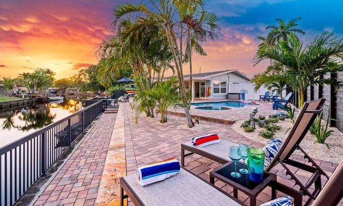 🌴 Coastal Oak — Waterfront Paradise! 💦 Heated salt pool (86° year-round), 100 ft of water frontage with kayaks, paddle boards & fishing dock 🎣. Just 5 miles to the beach with fire pit, BBQ, and multiple outdoor lounge areas for the perfect South Florida escape! 🏖