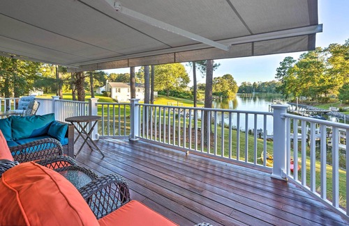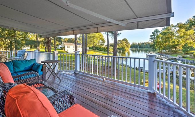 WATERFRONT VIEWS: Furnished deck w/ retractable awnings, gas grill, front porch w/ rocking chairs, waterfront yard, private dock w/ 2 floating docks, life jackets