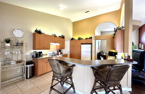 The fully equipped kitchen makes mealtimes a breeze, featuring a Keurig single-serve coffee maker, a 12-cup carafe brewer, microwave, dishwasher, large pantry, and breakfast bar—perfect for morning coffee or a casual snack. The adjacent dining area seats six and opens seamlessly to the lanai, blending indoor comfort with outdoor living in true Florida style.