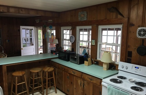 Dine inside or out. The bar counter in the kitchen seats 6 and a round table seats 4-5 more. The large picnic table on the front porch seats up to 8.