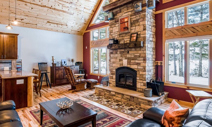 This Northern Wisconsin getaway is the perfect palace no matter the time of year. In the winter the snow capped home and forested terrain offer nearby winter activities such as ice skating and snowmobiling. And in the warmer months, enjoy some time by a lake, or take a bike ride or walk on one of the numerous trails. This beautiful lake home is centrally located on a pristine chain of lakes. Spend hours each day enjoying the clear sandy bottom lakes that offer fishing, boating, swimming and creating lasting memories with your family