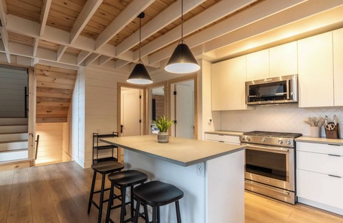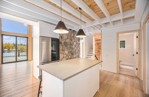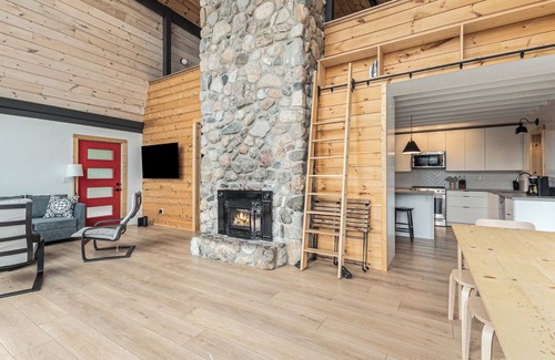 The Nordic Lodge is truly a friends and family vacation experience. It includes a grand open loft primary bedroom on top floor with views of the lake and ensuite bath with a deep tub. Two additional bedrooms on the main floor with a shared bathroom. A modern gourmet kitchen with every amenity one could desire, and an open concept grand living room/dining area with a great stone chimney and magnificent views of the lake. Just off of the living rooms is a large deck furnished for outdoor enjoyment and bbq for grilling.