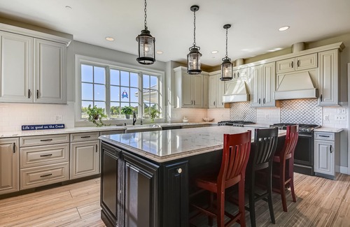 The farmhouse has a spacious/open floor plan with adjacent breezeway and detached garage/exercise room and full bath. There is a Master bedroom wing on the main floor with an additional master suite located on 2nd floor. The bathrooms have all glass shower doors and tile. The kitchen is bright and spacious with an 8 ft. quartz island, porcelain tile, 2 ovens, farm sink and wine/coffee bar. Family/TV room has granite wet bar. 2nd floor observation deck provides wide views of Harris Creek. There are 2 fireplaces (wood and gas) and entire back of house is encompassed by a 90 ft. brick and bluestone porch. Wake up to the sounds of watermen catching crabs for your evening dining pleasure at home or at any of the fabulous restaurants in St. Michaels or Tilghman Island. Explore the area with bikes and kayaks that are provided. Enjoy the evening with after dinner S’mores at our fire pit.